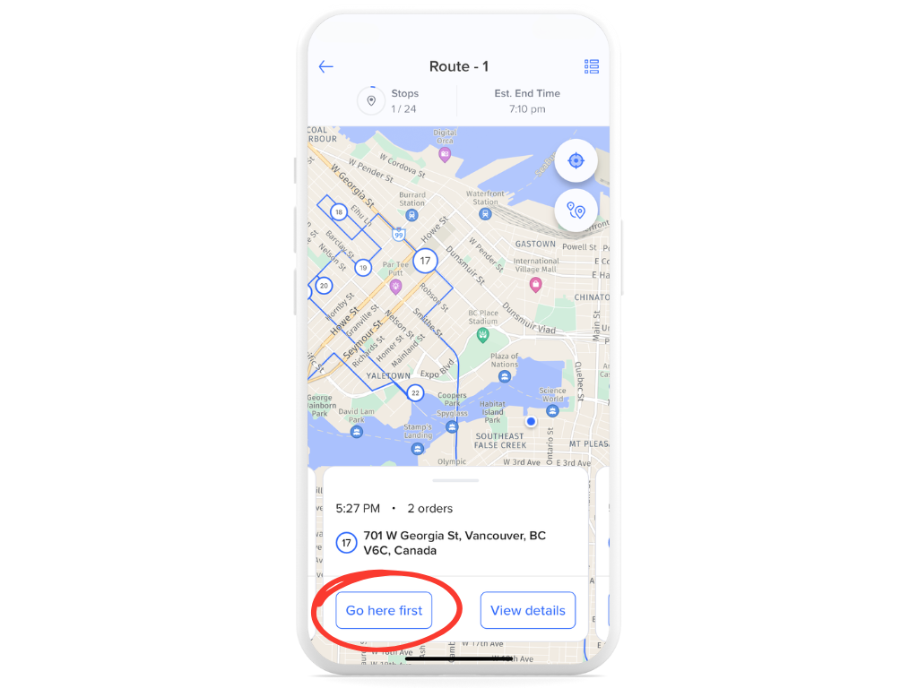 Drivers can also choose to deliver out of sequence. Click Go here first to prioritize a specific delivery first, before continuing with the rest of the route.