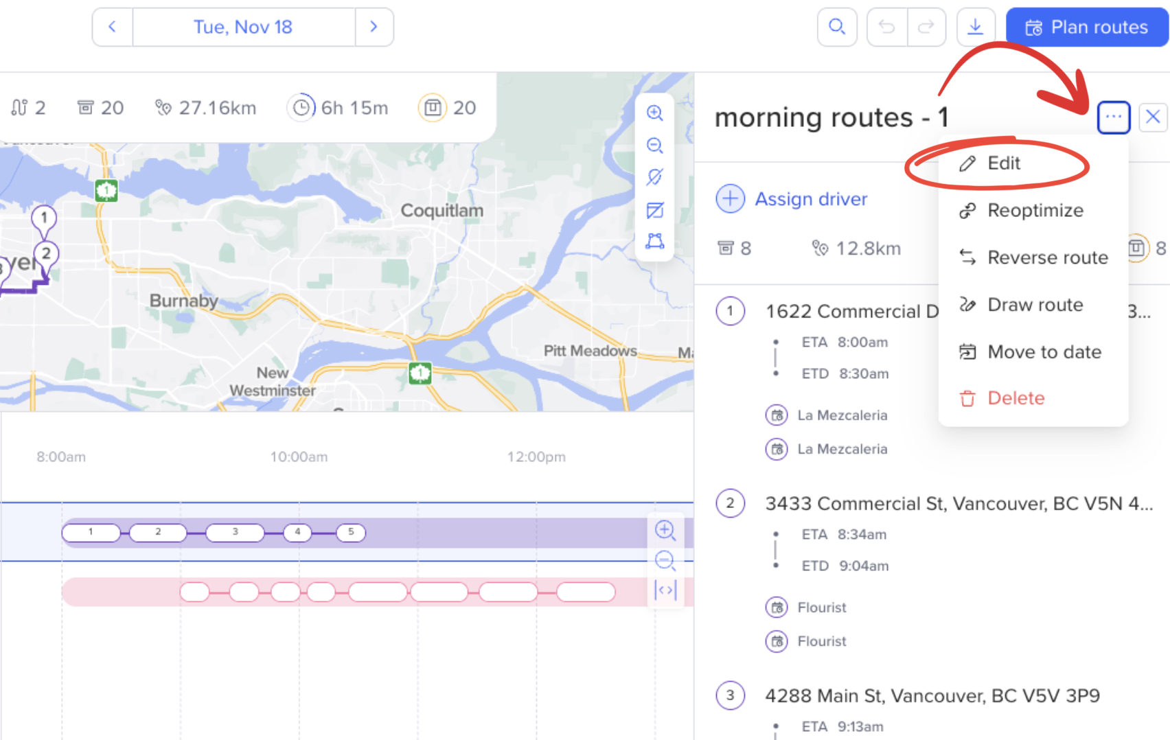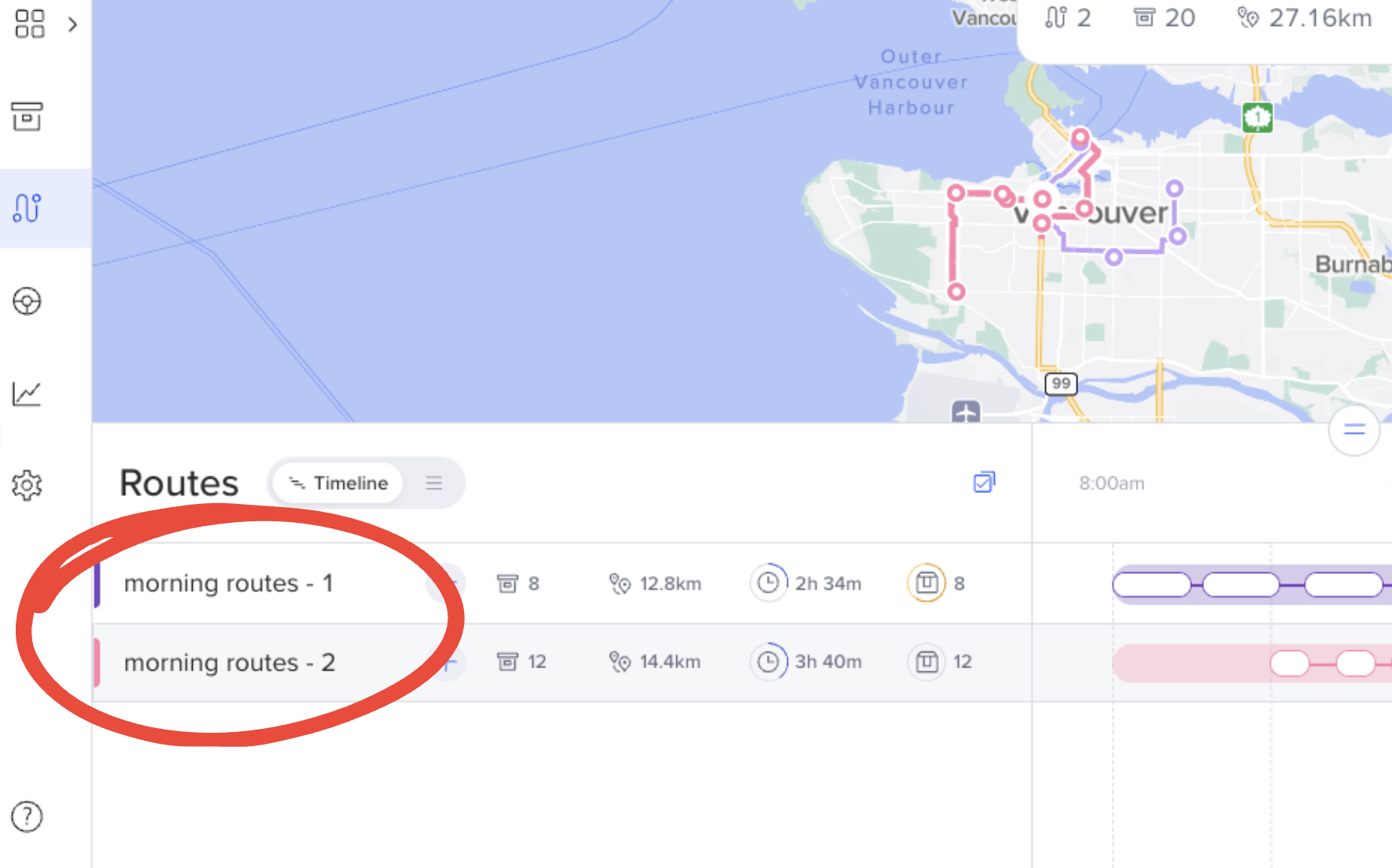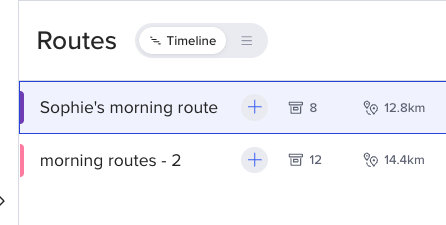 To edit the name of a route, click on the route on either the map or the timeline to bring up the right-hand route panel.