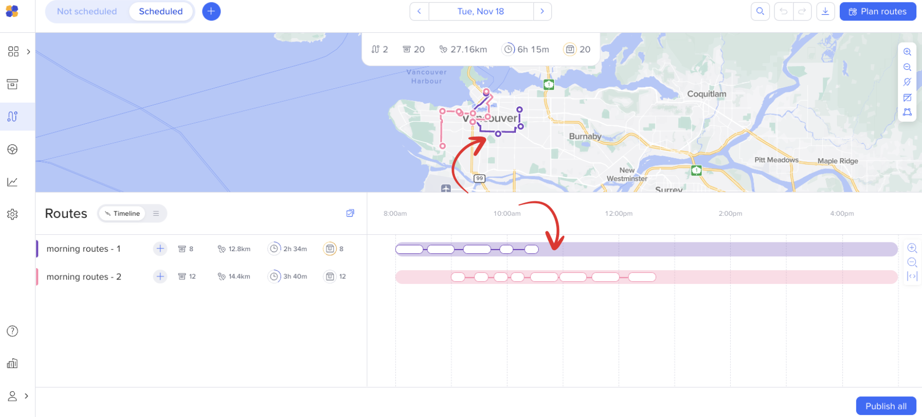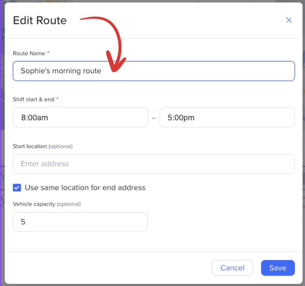 If you have multiple routes from the same template, Routific will add a number to differentiate them. If your template is called Morning routes and you have 2 routes, they will then be named Morning routes - 1 and Morning routes - 2.