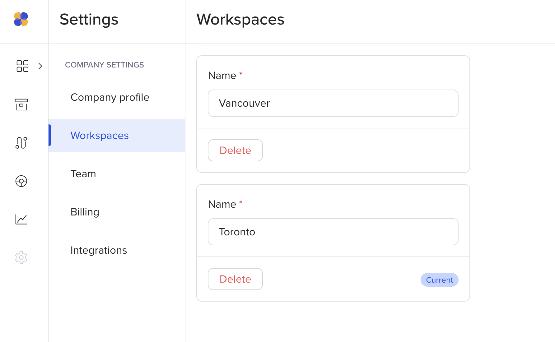 If you operate in more than one place, you should create a Workspace for each one. For example, you might have one workspace for Vancouver and another for Toronto.