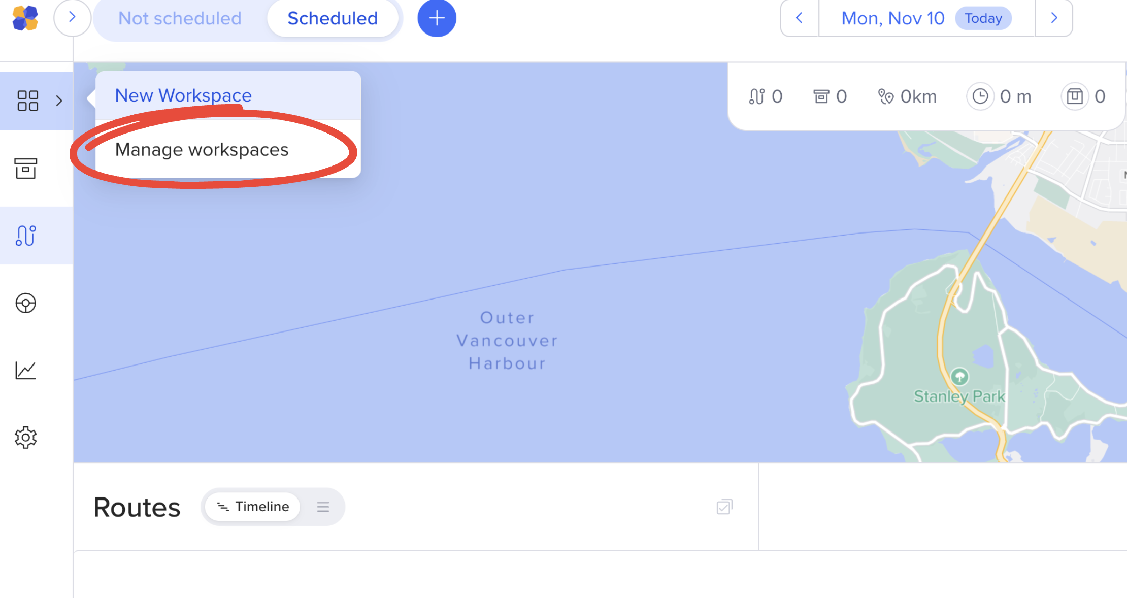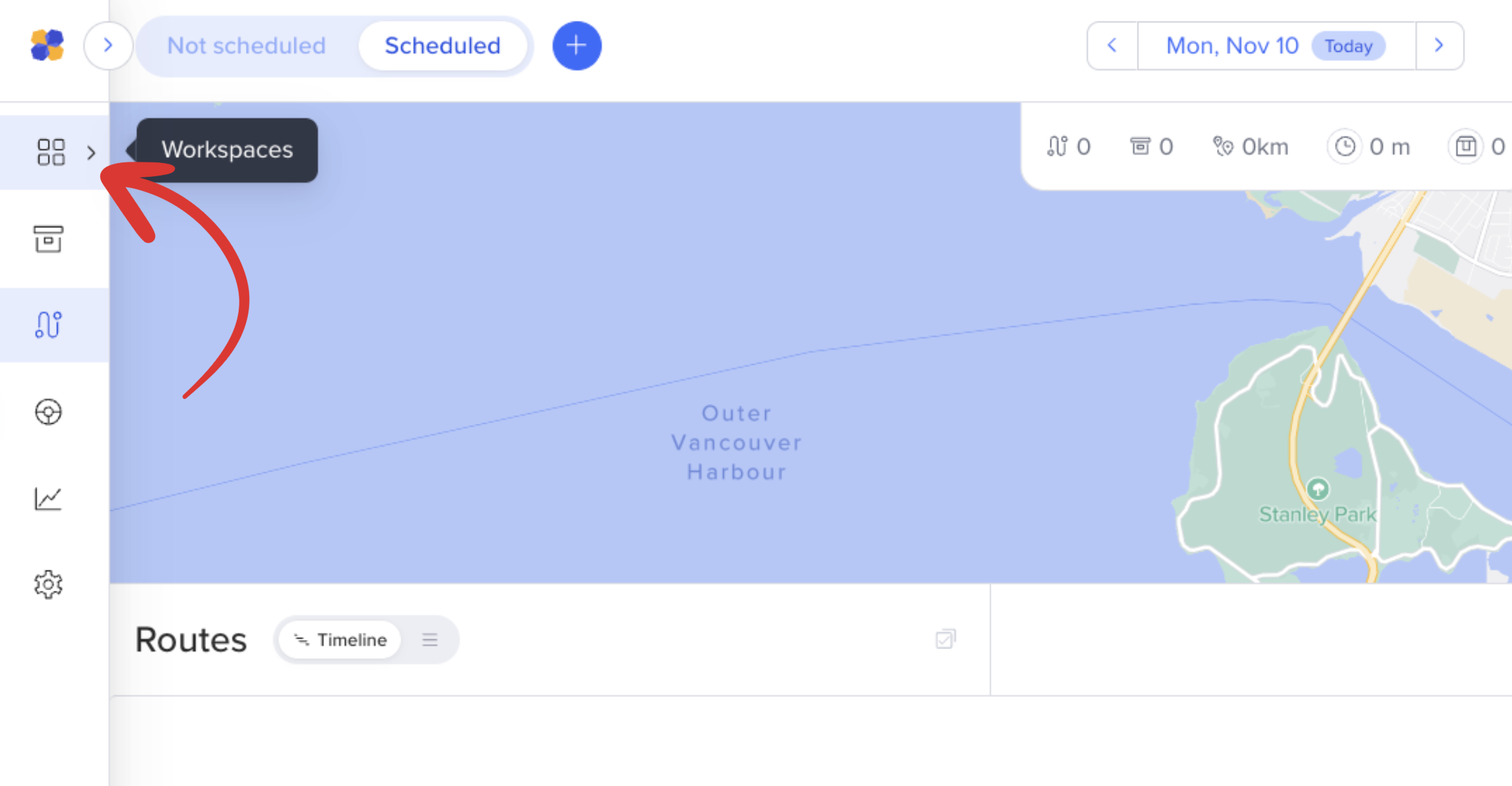 Access workspaces by clicking the icon with 4 squares in the upper left corner, under the Routific Logo.