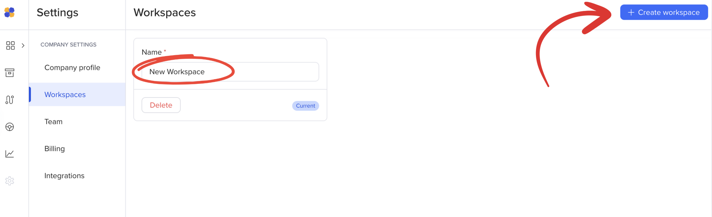 In your Workspaces settings, you can rename your Workspace by selecting the words New workspace and typing a new name, or click Create workspace to create an entirely new one.