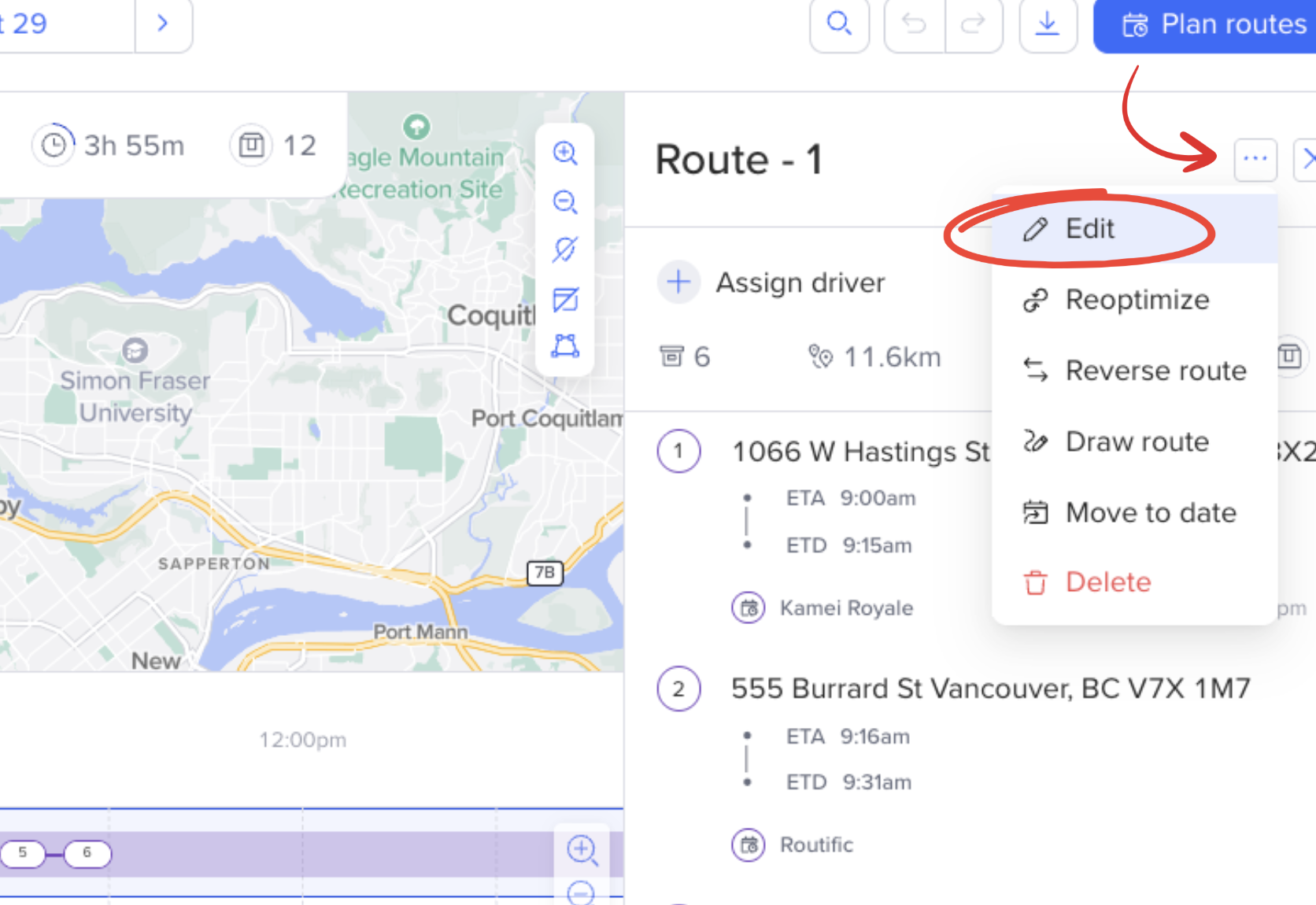 2. Click the three dots (…) in the top right corner of the route panel and choose Edit