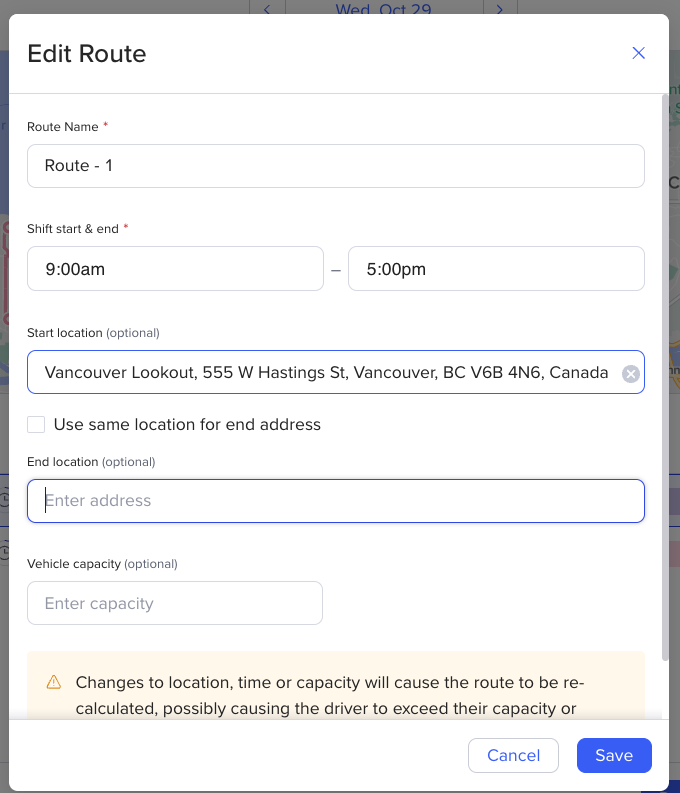 *Please keep in mind that if a route has already been published, the start and end times cannot be edited. Once your driver starts their route in the mobile app, the start and end times will automatically adjust.
