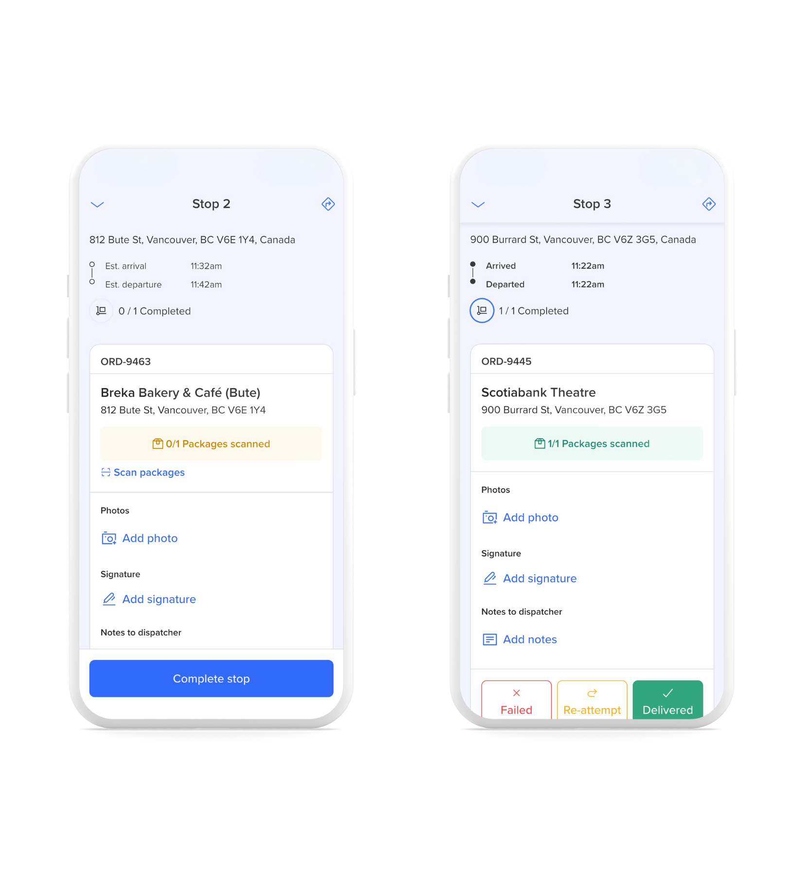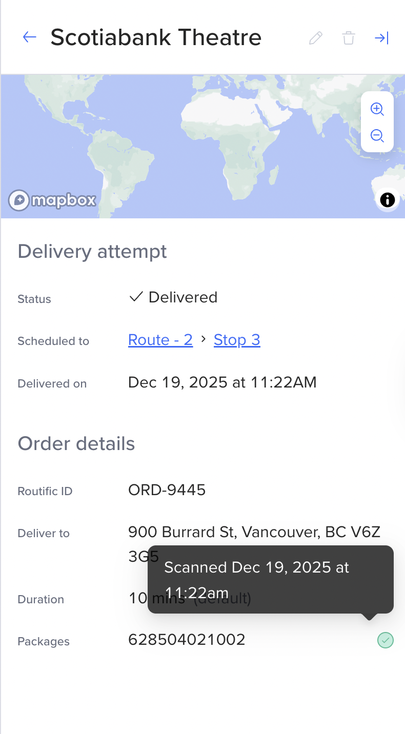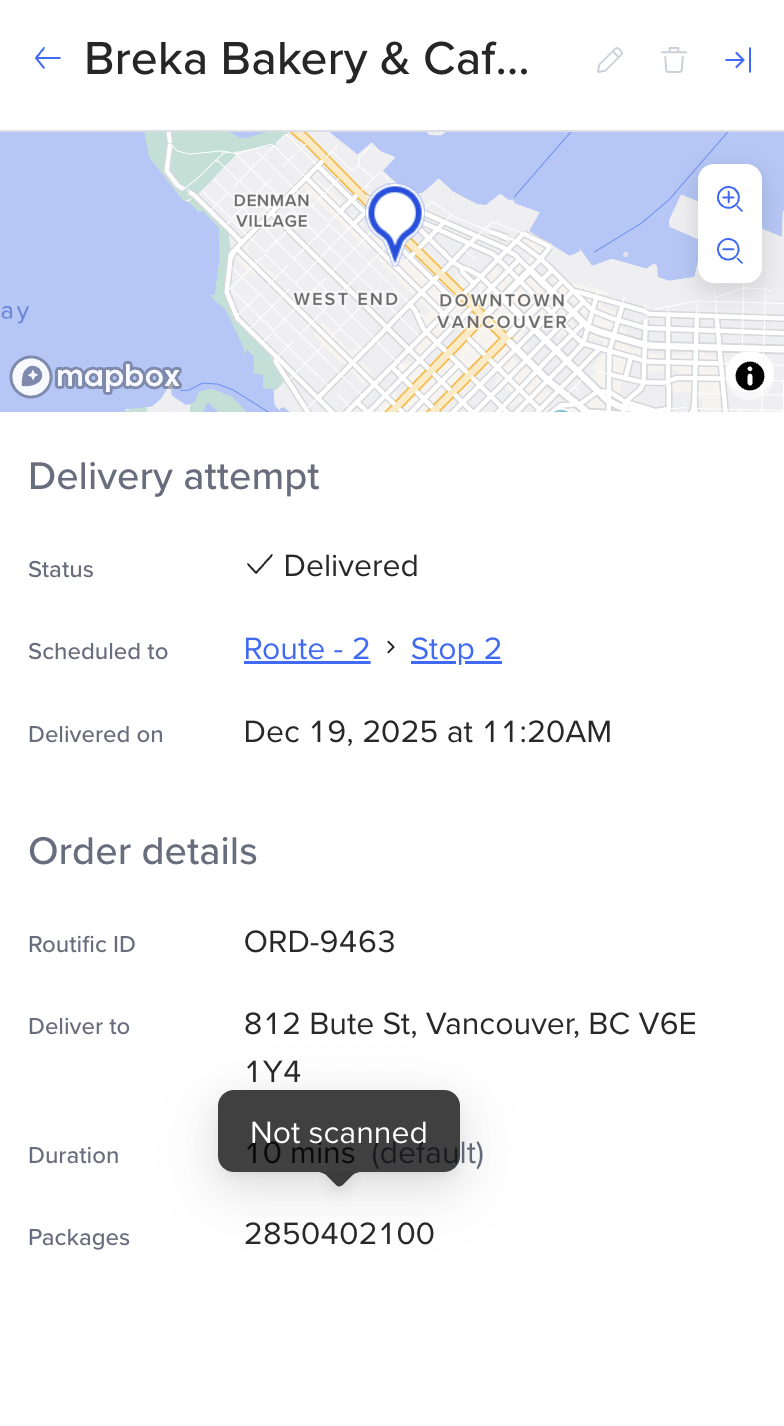 When drivers scan packages with their mobile phone camera, Routific will validate the correct package is being scanned.