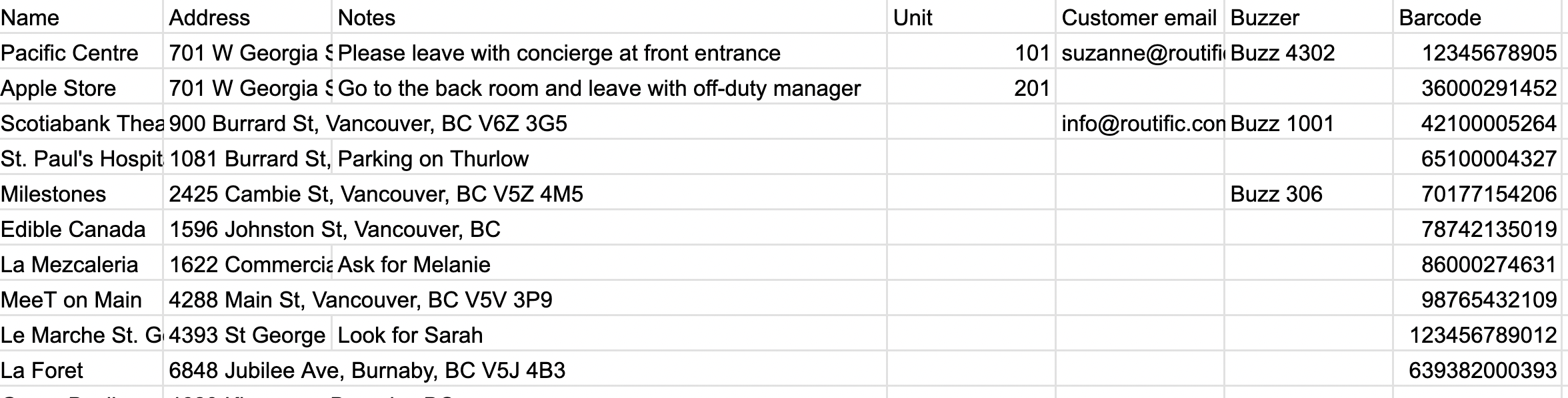If you use the API to import your orders into Routific, you can now include barcode information. Please see our API docs for details.