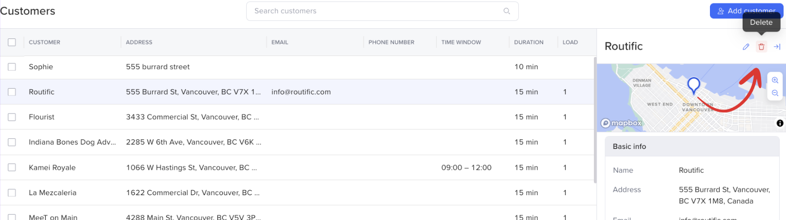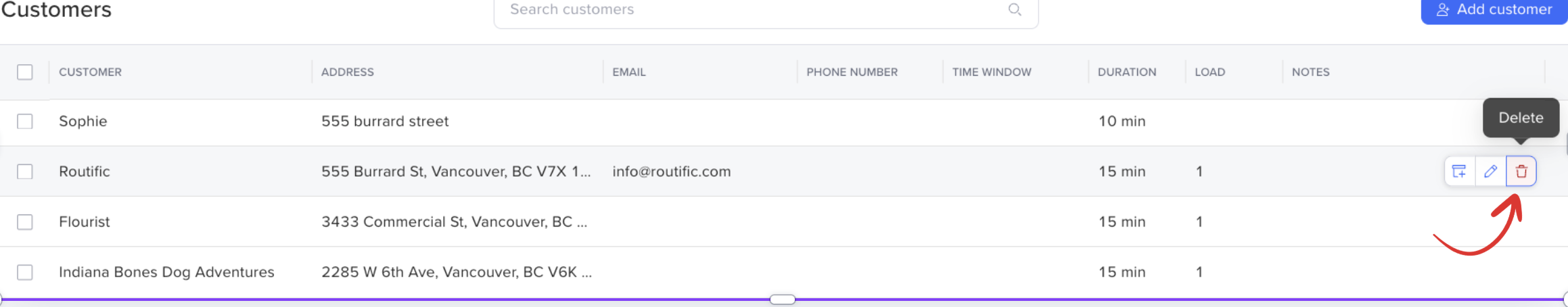 Hover your mouse over any customer in the Customers page, and a red trash can icon will appear on the right-hand side. Click it to delete your customer.