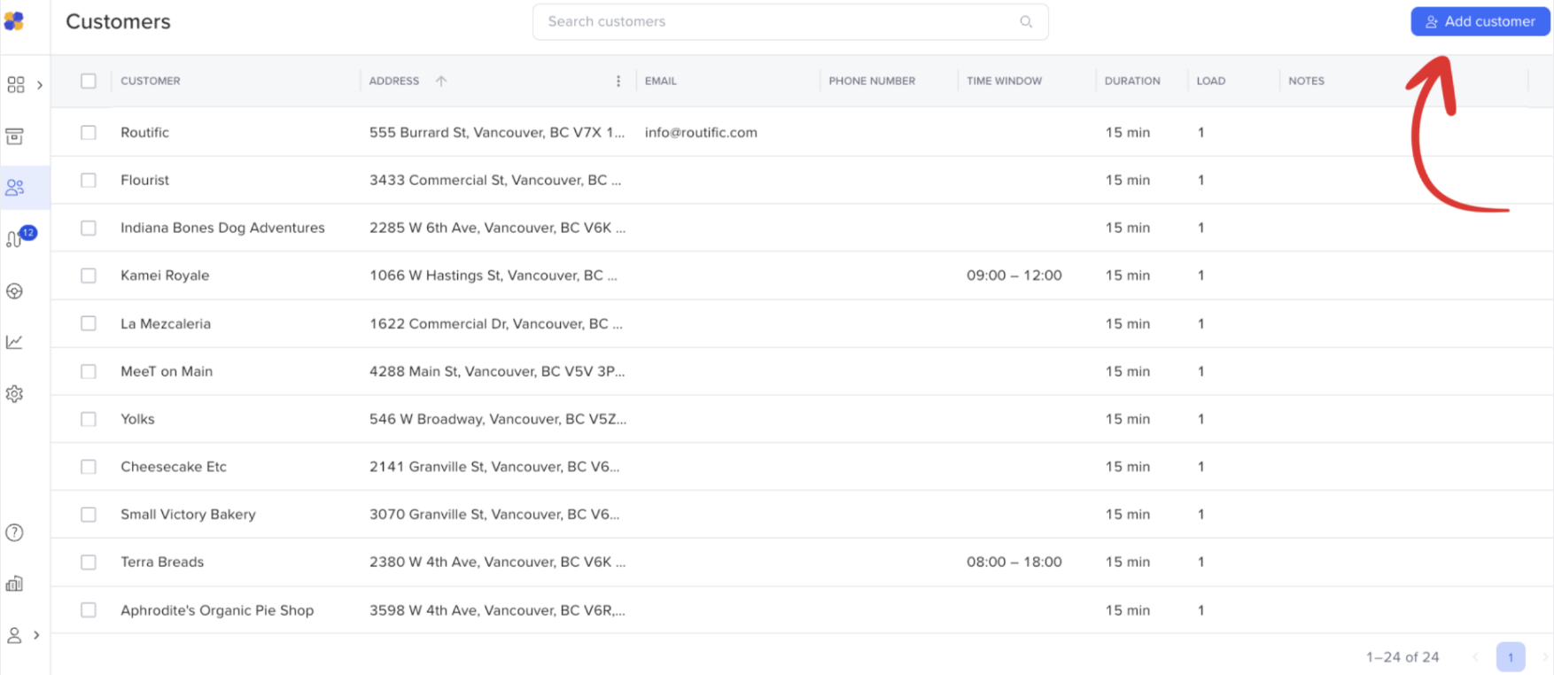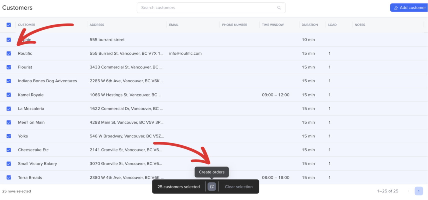 Save recurring customers to create a master list you can reuse again and again! Instead of uploading a spreadsheet or manually creating orders each time, simply select from your saved customers when building routes.