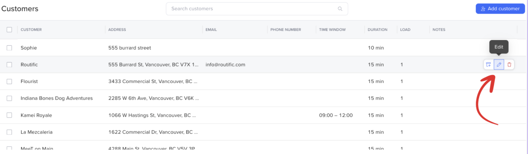 Hover over any customer in the Customers page, and a pencil icon will appear on the right-hand side. Click the pencil icon to open the customer details. Once you have made your changes, click Save changes.