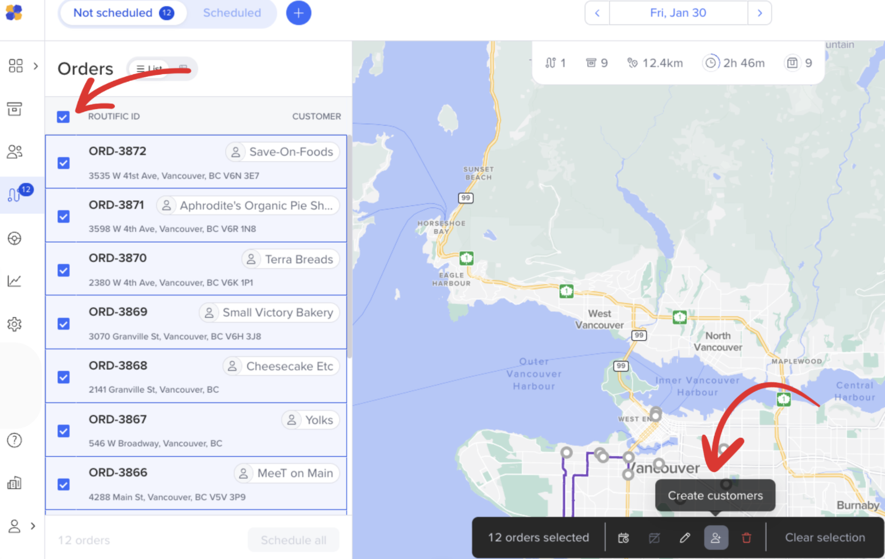 Once you have uploaded your orders, you can select all with the select all box in the top left of the not-scheduled tray. Then, click the Create customers icon at the bottom of the screen.