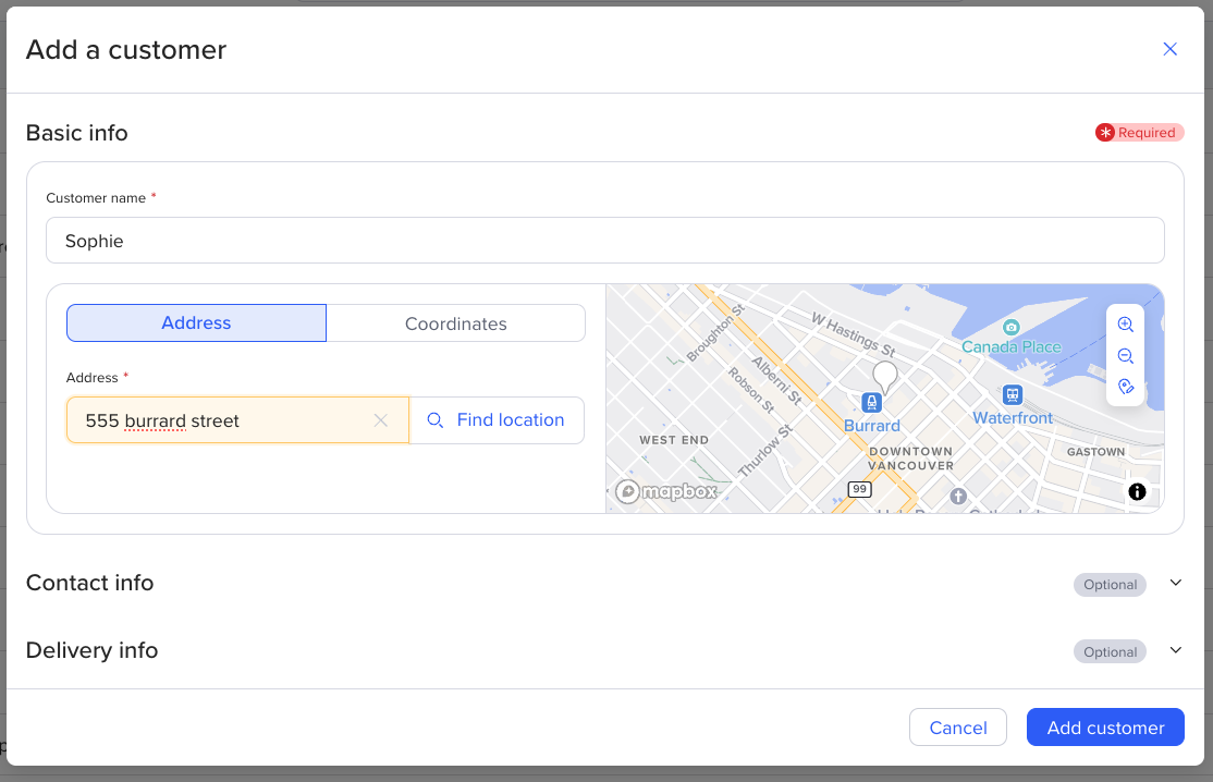 Click the blue Add customer button in the top right-hand corner of the customers page. You will then be prompted to fill in your customer’s information.