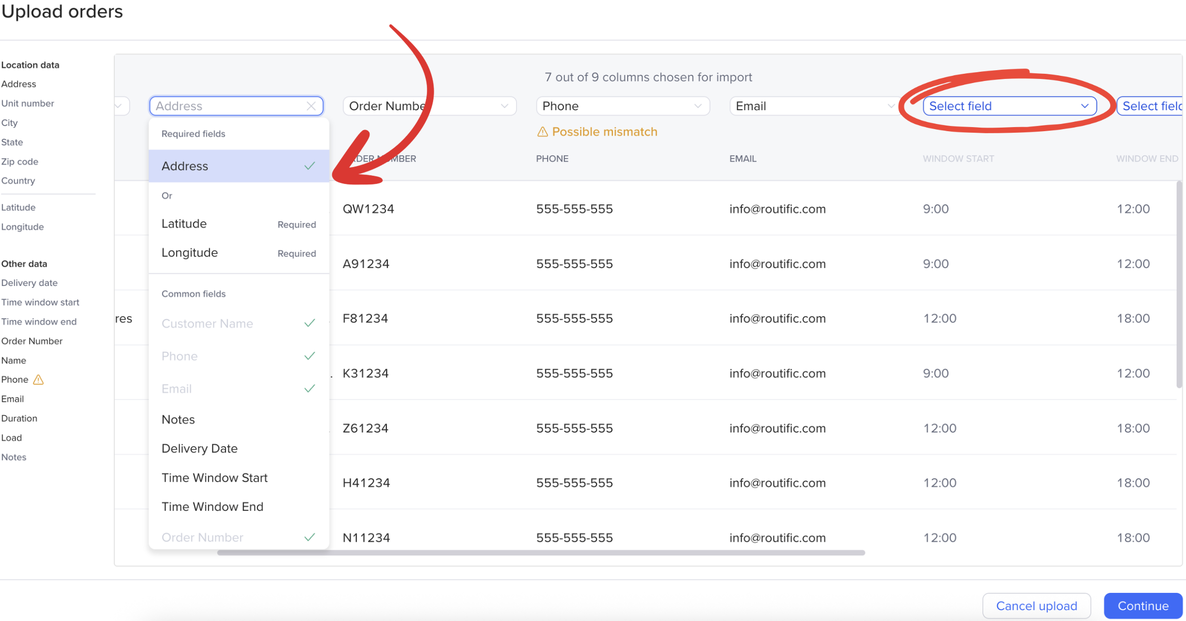Got more columns? No problem, you can create custom fields and map those fields when you upload your spreadsheet in Routific. (See below!)