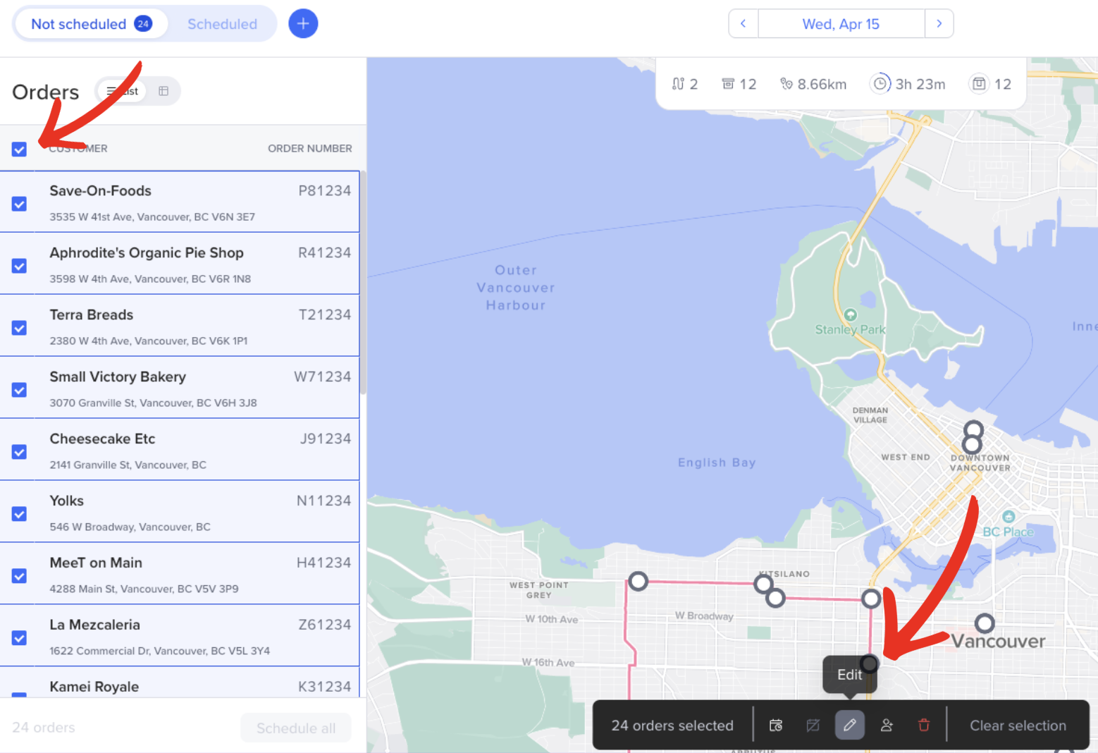 In the left-hand unscheduled tray, select the orders you want to edit, or select them all, whichever you need.