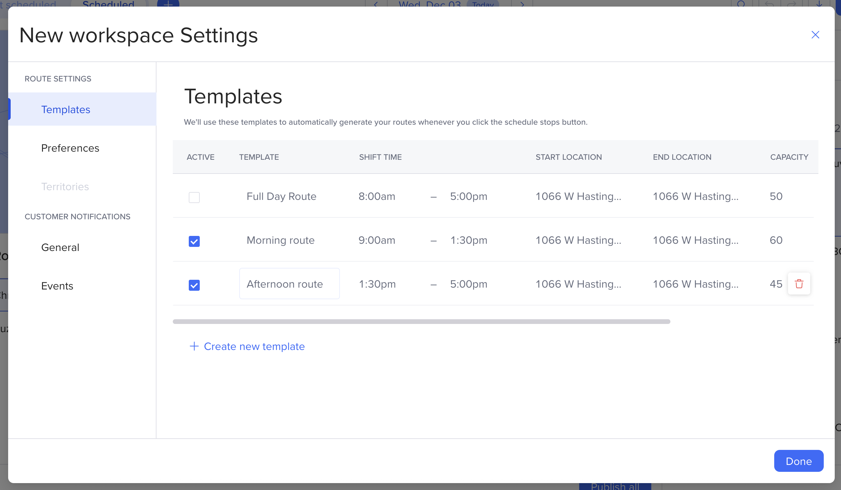 *Please note that editing templates will not adjust any current scheduled routes. It will, however, affect any new routes to be scheduled.