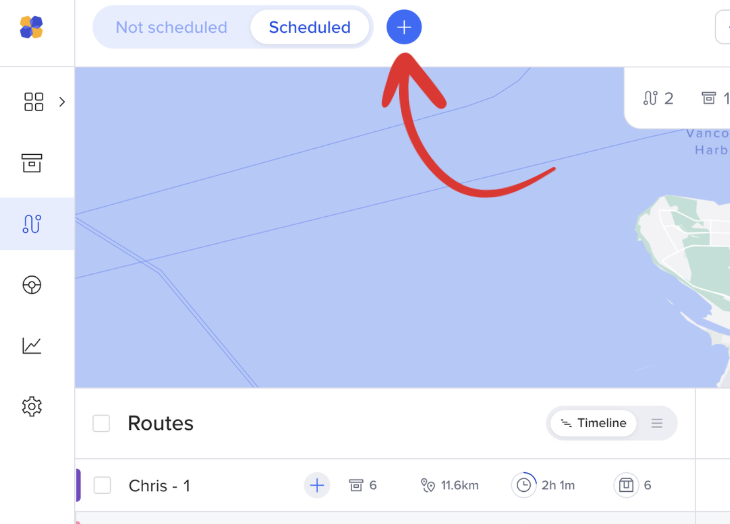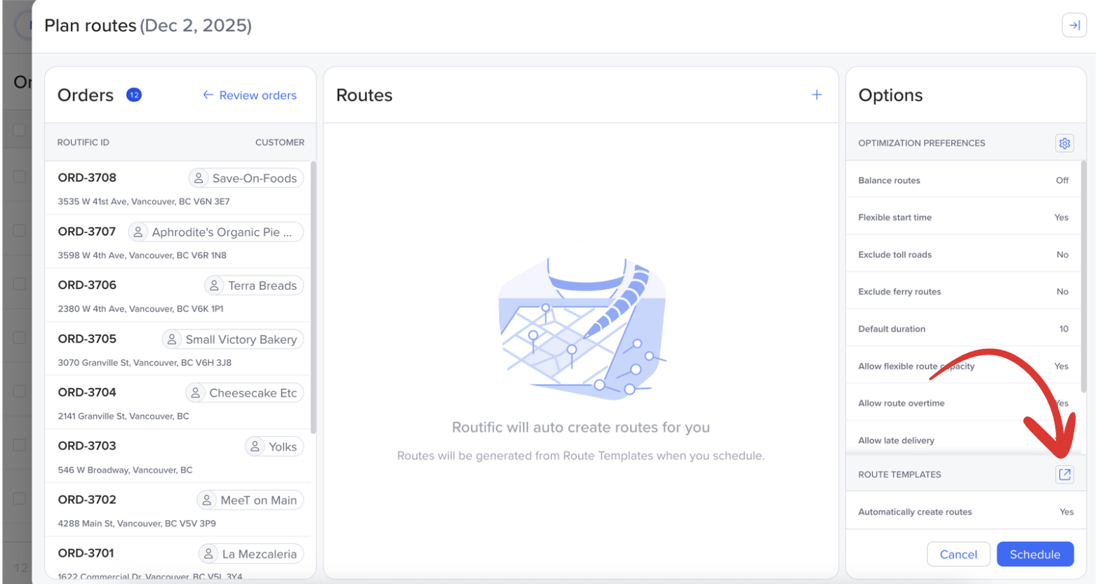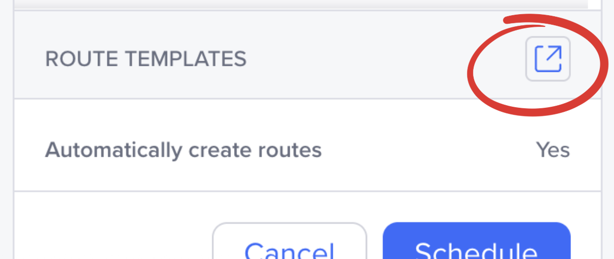 You can also access your route template settings when scheduling routes, in the bottom right-hand corner of the Plan routes screen. Click the square icon with the arrow to access your route templates settings.